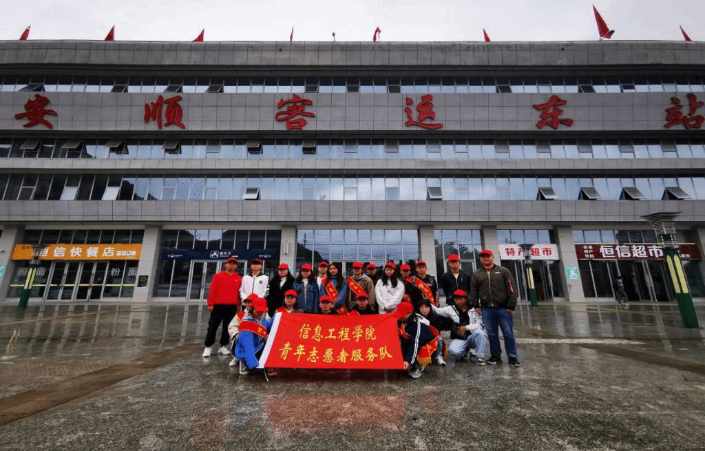 为热烈庆祝新中国成立70周年,着眼培养时代新人,积极培育社会主义核心价值观,大力弘扬共筑美好生活梦想的时代新风,引领广大青年志愿者和志愿服务组织广泛开展形式多样的志愿者服务活动,传播奉献友爱互助进步的精神,推动学雷锋志愿服务在全社会蔚然成风,信息工程系志愿者服务队在2019年10月27日组织30名志愿者分别在安顺东客站、南马广场进行文明劝导服务暨文明城市创建宣传活动,志愿者们为出行市民提供路线指引、引导乘客排队上下车,协助交警进行交通疏导,营造文明的出行氛围。