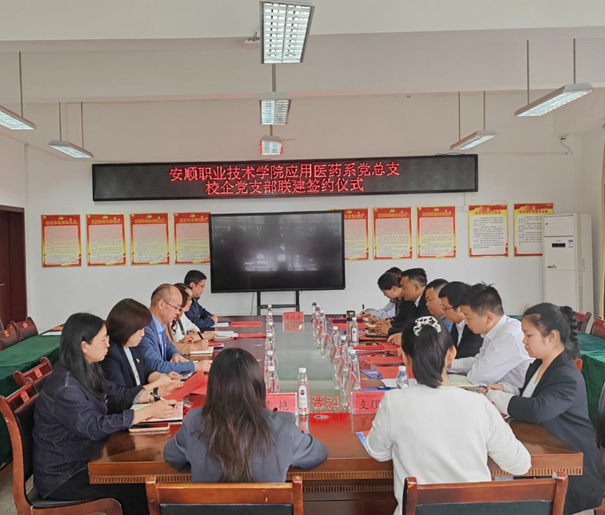 为深入贯彻落实党的二十大精神,进一步增强基层党组织的政治功能和组织功能,打造产教融合党建联盟新样态,2025年5月15 日下午,安顺职院应用医药系党总支组织开展校企党支部联建签约仪式。安顺职院党委委员、统战部部长龚文瑶,应用医药系党总支委员,应用医药系教工党支部、学工党支部书记以及贵州百灵企业集团、贵州省健一生药业连锁有限责任公司、中国贵航集团三0二医院、安顺市西秀区妇幼保健院等联建党支部书记出席签约仪式。签约仪式由应用医药系党总支书记周琰主持。