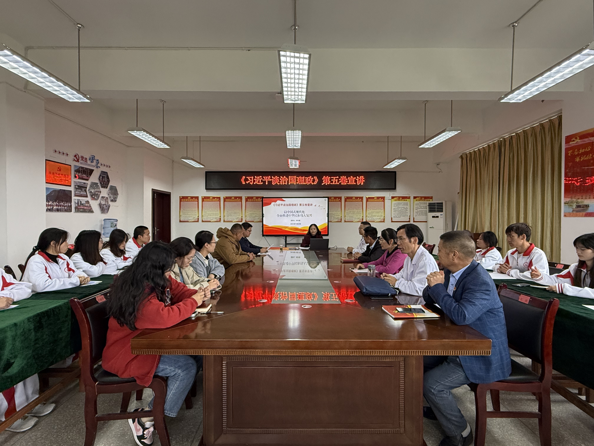 2025年10月24日下午,安顺职业技术学院党委委员、统战部部长龚文瑶同志到应用医药系开展《习近平谈治国理政》第五卷专题宣讲。应用医药系全体党员、无党派人士、学生入党积极分子共计60余人参加宣讲活动,宣讲活动由应用医药系党总支副书记黄立坪主持。