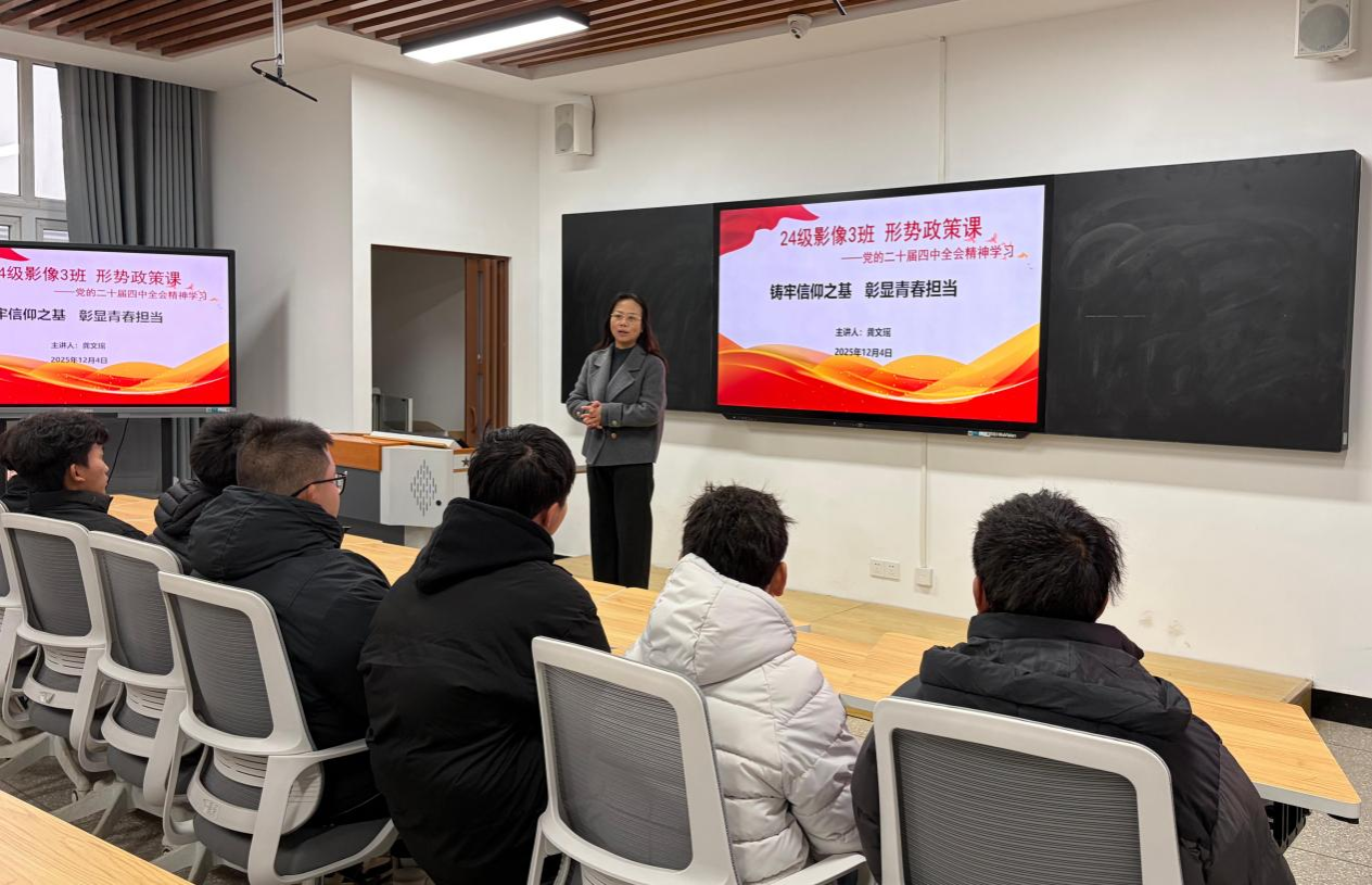2025年12月4日下午,安顺职院党委委员、统战部部长龚文瑶同志为应用医药系24影像3班同学讲授形势与政策,50余名同学聆听了此次授课。