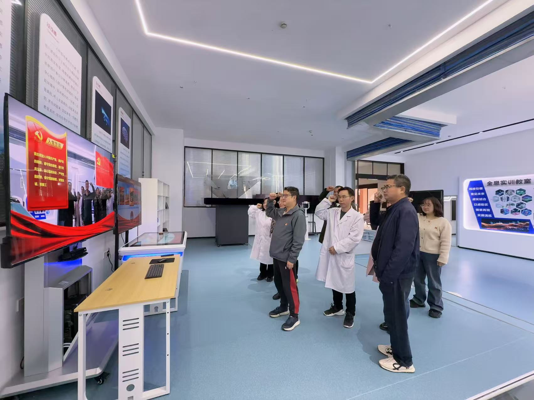 为深入学习贯彻党的二十大及二十届四中全会精神,创新党建工作形式,推动党建与教学科研深度融合,2026年3月12日下午,安顺职业技术学院应用医药系教工党支部在健康服务技术虚拟仿真实训基地,以“数智赋能强党性 沉浸体验砺初心”为主题,开展3月份主题党日活动,支部全体党员参加。