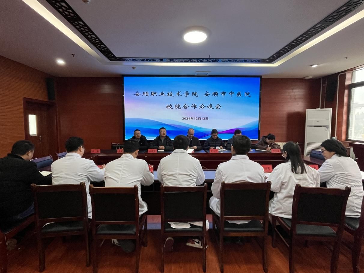 为加强校院合作,深化产教融合,进一步提升中医药康养人才培养及社会服务水平,2024年12月12日上午,应用医药系党政班子成员及相关专业教师一行7人赴安顺市中医院学习交流。市中医院副院长黄聪,副院长赵志详,医教科、康复科、检验科、药剂科等相关职能部门领导陪同交流。