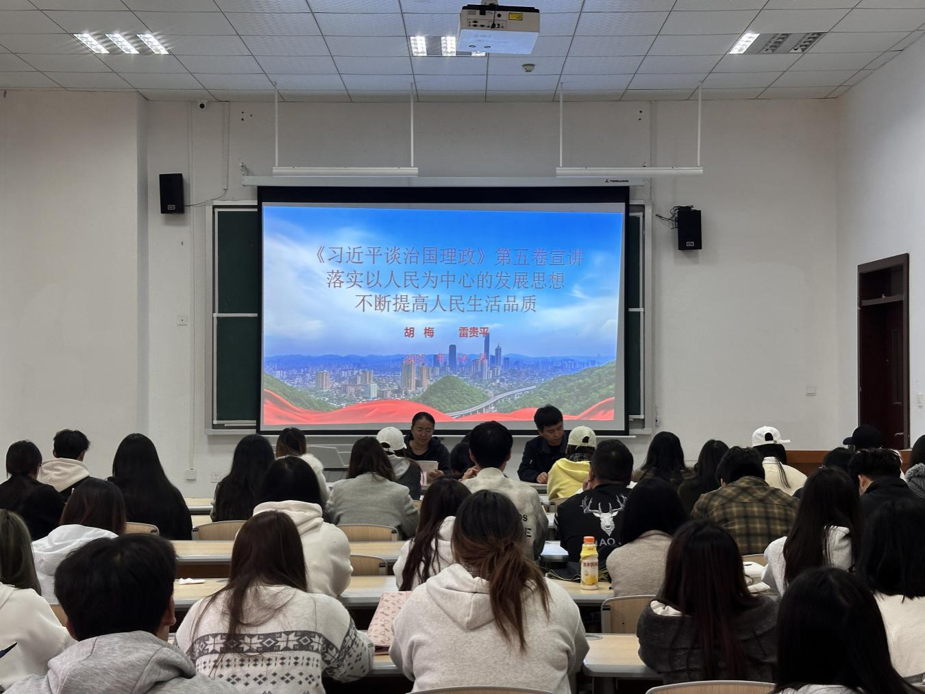 为深入学习贯彻《习近平谈治国理政》第五卷精神,切实推动党的创新理论进校园、进课堂、进头脑,2025年10月20日,安顺职业技术学院经济管理系党总支在12101教室开展“理论宣传二人讲”活动。党总支书记胡梅负责理论宣讲,团总支书记雷贵平负责实践解读,系部100余名学生到场聆听。