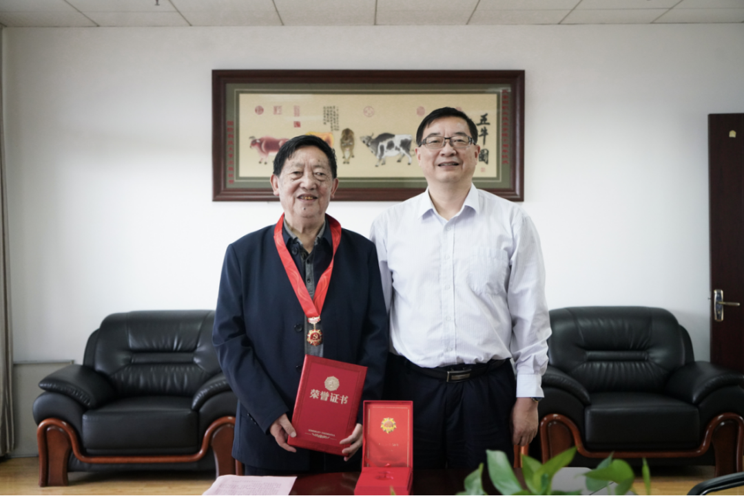 为进一步弘扬党的光荣传统和优良作风,增强党员的荣誉感、使命感,2024年6月26日,学院党委书记许志为退休老党员杨德宽同志颁发“光荣在党50年”纪念章。