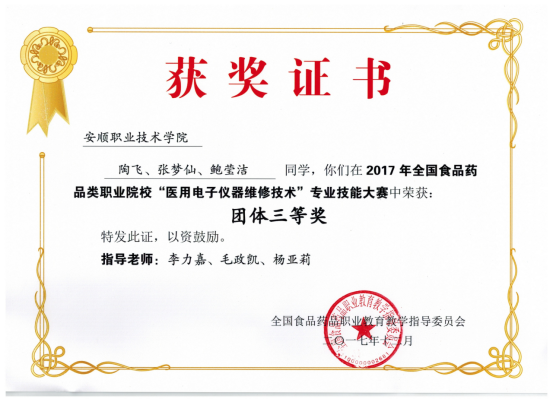 陶飞、张梦仙、鲍莹洁同学获2017全国食品药品类职业院校“医用电子仪器维修技术”专业技能大赛团体三等奖