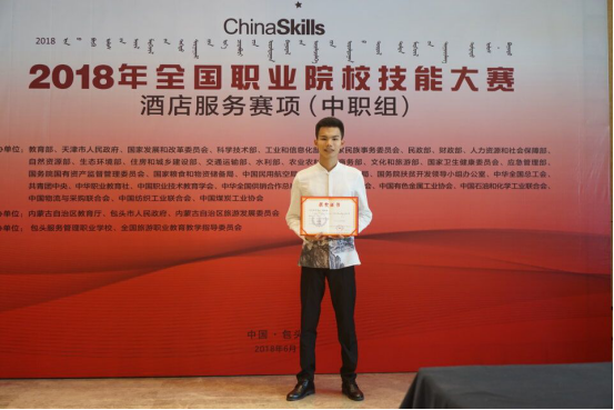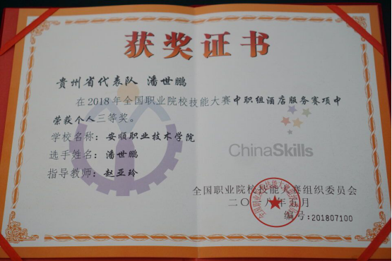 潘世鹏同学获2018年全国职业院校技能大赛中职组酒店服务个人三等奖