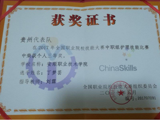 丁梦芸同学获2017年全国职业院校技能大赛中职组护理技能个人三等奖