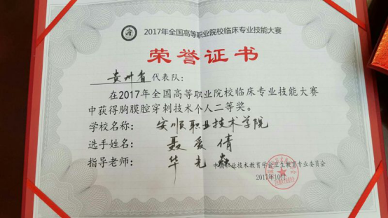 聂爱倩同学获2017年全国高等职业院校临床专业技能大赛胸膜腔穿刺技术个人二等奖
