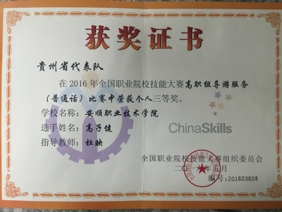 高子健同学获2016年全国职业院校技能大赛高职组导游服务(普通话)个人三等奖