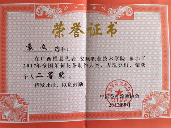 袁文老师获2017年全国茉莉花茶制作大赛个人二等奖