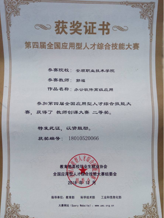 郭福老师获2018年第四届全国应用型人才综合技能大赛教师创课大赛二等奖