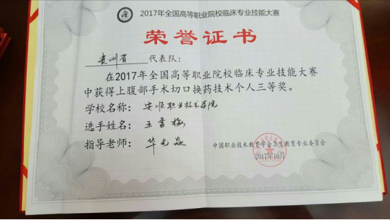 王雪梅同学获2017年全国高等职业院校临床专业技能大赛上腹部手术切口换药技术个人三等奖