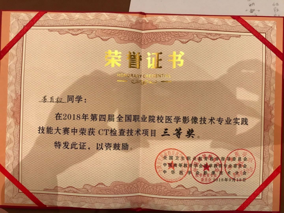 李有权同学获2018年第四届全国职业院校医学影像技术专业实践技能大赛CT检查技术三等奖