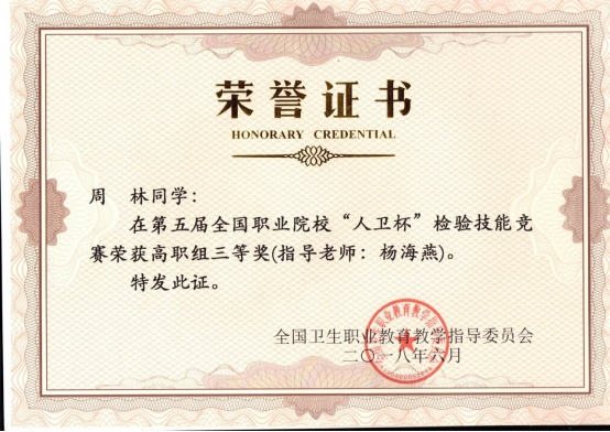 周林同学获2018年第五届全国职业院校“人卫杯”检验技能竞赛高职组三等奖