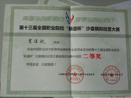 曾建秋同学获2017年第十三届全国职业院校“新道杯”沙盘模拟经营大赛全国总决赛二等奖