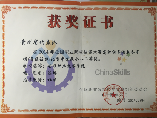 陈端同学获2014年全国职业院校技能大赛高职组导游服务(普通话组)个人二等奖