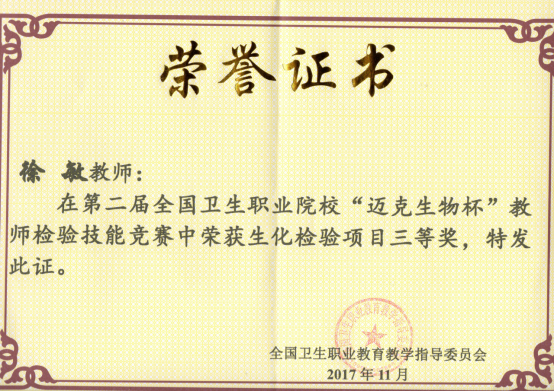 徐敏老师获2017年第二届全国卫生职业院校“迈克生物杯”教师检验技能竞赛生化检验项目三等奖