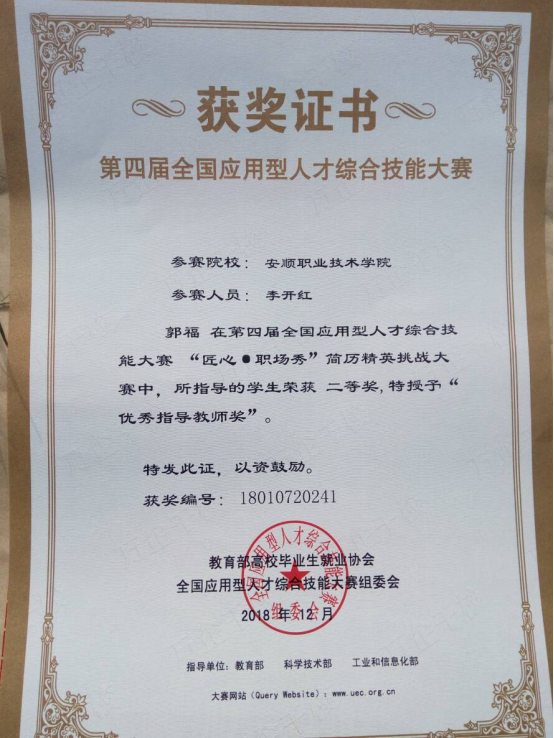 李开红同学获2018年第四届全国应用型人才综合技能大赛“匠心•职场秀”简历精英挑战大赛二等奖