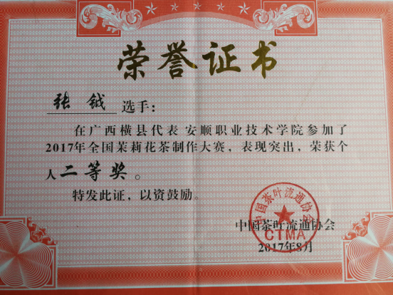 张钺老师获2017年全国茉莉花茶制作大赛个人二等奖