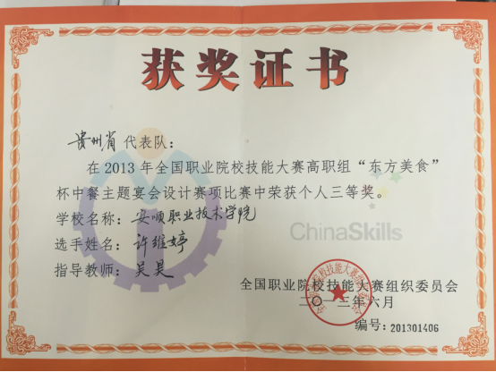 许维婷同学获2013年全国职业院校技能大赛高职组中餐主题宴会设计个人三等奖