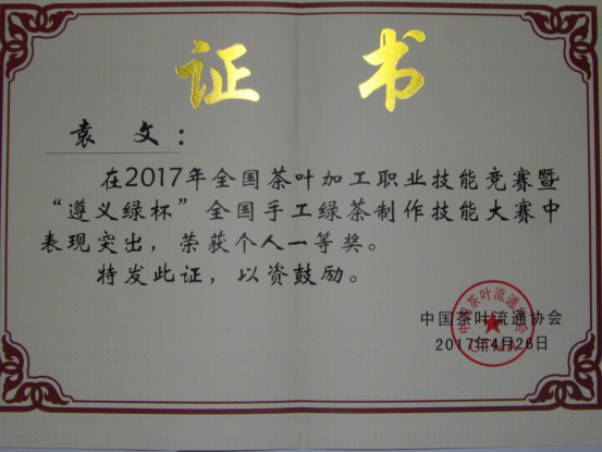 袁文老师获2017全国茶叶加工职业技能竞赛暨”遵义绿杯“全国手工绿茶制作技能大赛个人一等奖