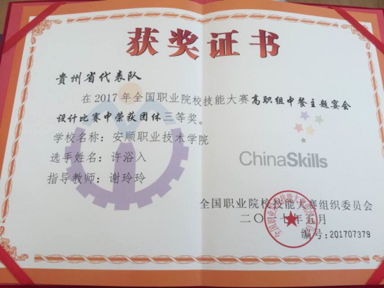 许浴入、彭方斌、陈宝莉同学获2017年全国职业院校技能大赛高职组中餐主题宴会设计团体三等奖