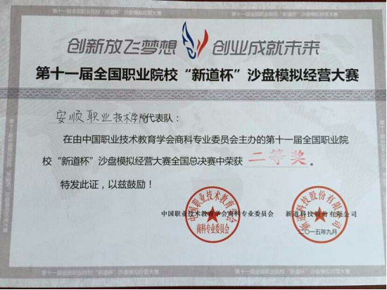 安顺职业技术学院代表队获2015年第十一届全国职业院校“新道杯”沙盘模拟经营大赛全国总决赛二等奖
