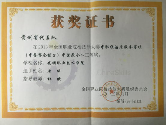 唐丽同学获2013年全国职业院校技能大赛中职组酒店服务(中餐宴会摆台)个人三等奖