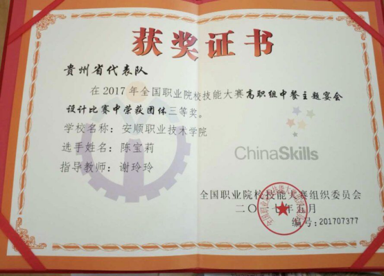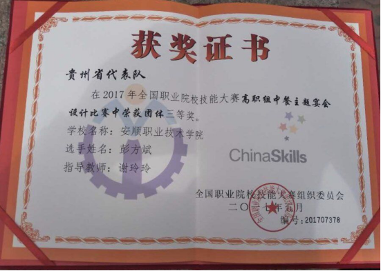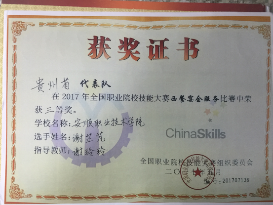 谢芷芃同学获2017年全国职业院校技能大赛西餐宴会服务三等奖