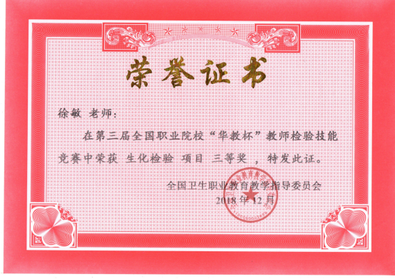 徐敏老师获2018年第三届全国职业院校“华教杯”教师检验技能竞赛“生化检验”项目三等奖