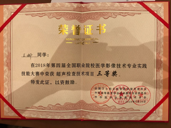 王娜同学获2018年第四届全国职业院校医学影像技术专业实践技能大赛超声检查技术三等奖