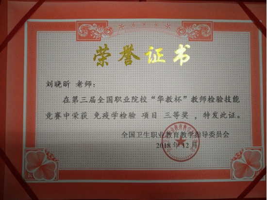 刘晓昕老师获2018年第三届全国职业院校“华教杯”教师检验技能竞赛“免疫学检验”项目三等奖