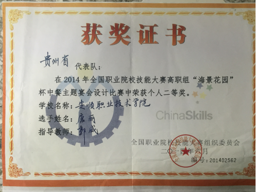 唐丽同学获2014年全国职业院校技能大赛高职组中餐主题宴会设计个人二等奖