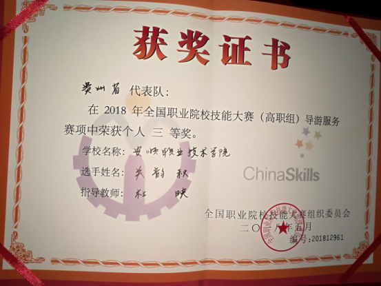 关韵秋同学获2018年全国职业院校技能大赛高职组导游服务个人三等奖