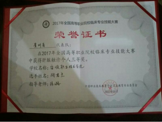 胡君兰同学获2017年全国高等职业院校临床专业技能大赛肝脏触诊个人三等奖
