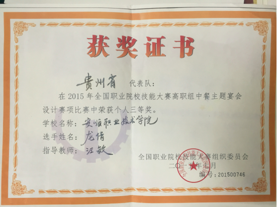 龙倩同学获2015年全国职业院校技能大赛高职组中餐主题宴会设计个人三等奖