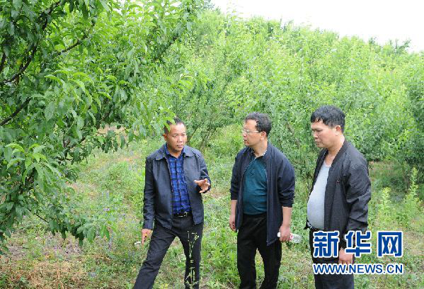 4月30日,在贵州省镇宁自治县翁解村,安顺职院的农业专家邵亦群(左)指导种植户李光辉查看李子树病虫害情况。新华社记者 罗羽 摄