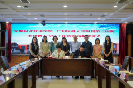 4月21日上午,安顺职业技术学院与广州医科大学附属第三医院隆重举行共建博士专家工作站签约揭牌仪式。广州医科大学附属第三医院党委委员、副院长杨宁、陈艳红博士(硕士生导师)、罗轶群博士以及护理部主任陈丽萍(硕士生导师),学院党委副书记、院长李昕昌,应用医药系、护理系、继续教育中心(国际教育中心)负责人参加了签约揭牌仪式。会议由党委委员、副院长方莉主持。