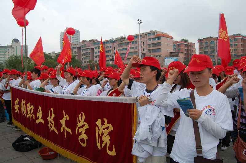 二、2010年4月 30日下午,我院团委及各系团总支书记带领180名同学在若飞广场参加安顺市 “三创”志愿者启动仪式。仪式结束后前往若飞故居至北街路口一带进行卫生大扫除志愿者活动,擦洗道路两侧防护栏、果皮箱等环卫设施和拾捡绿化带烟头、白色垃圾等,同时对市民作“三创”活动的宣传,为我市广泛开展“三创”活动开了一个好头。