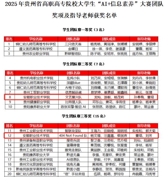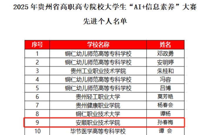 11月25日,贵州省图书馆学会公布2025年贵州省高职高专院校大学生“AI+信息素养”大赛获奖名单。安顺职院斩获学生团队赛二等奖1项,三等奖1项,学院荣获“优秀组织奖”,孙春梅老师获“先进个人”荣誉称号。