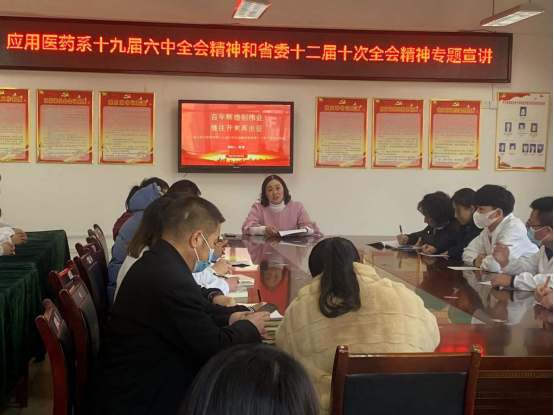 为宣传贯彻党的十九届六中全会精神,在全系上下营造学习全会精神的浓厚氛围,推动全会精神在我系教育教学工作中落实见效,2021年12月23日,应用医药系党总支书记周琰同志以“百年辉煌创伟业,继往开来再出征”为主题,面向师生代表45人开展十九届六中全会精神专题宣讲。
