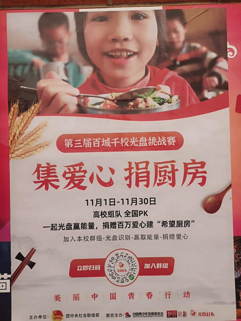 为进一步弘扬中华民族勤俭节约的传统美德,积极响应共青团号召“光盘行动”,呼吁信息工程系全体学生积极落实团中央联合中国青少年发展基金会、知行计划、光盘打卡共同推出的第三届百城千校光盘行动挑战赛,一起用光盘行动为农村贫困地区中小学援建希望厨房,为解决学生就餐难和营养不良问题作出贡献,特于2020年10月26日——2020年11月30日在信工系开展“光盘活动”。
