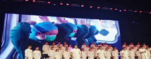 宣誓仪式上,方莉副院长首先代表学院班子致辞,她对医学院举行2018年“立德树人,医者仁心”医学生宣誓仪式的重要教育意义给予了充分肯定,同时向同学们提出三点希望,一是将严谨的医学学风传承下去,二是努力夯实专业知识根基,三是勇于实践,增强医学技能。17临床3班李德爵同学代表学生作了《我的医生梦》发言,他阐述了自己的梦想,号召同学们努力学习,将来为祖国的医药卫生事业做出贡献。伴随着隆重的乐声,医学院的领导及老师们为60名学生代表一一授予了神圣的医学胸章。接下来是宣誓仪式最神圣的时刻,在领誓人医学院团总支副书记付玛老师的带领下,医学院师生全体起立,举起右拳庄严宣誓。“健康所系,性命相托……我志愿献身医学,热爱祖国,忠于人民,恪守医德,……我决心竭尽全力除人类之病痛,助健康之完美,维护医术的圣洁和荣誉。……”铮铮的誓言打破了校园的宁静,同学们高握右拳,郑重承诺,慷慨洪亮的声音在宣告他们有信心和决心做一名优秀的医学生,为祖国医药卫生事业的发展和人类身心健康奋斗终身。最后是同学们带来的诗朗诵《生命的太阳》和合唱医护版《平凡之路》,在全场观众的合唱中,此次宣誓仪式完美落幕。