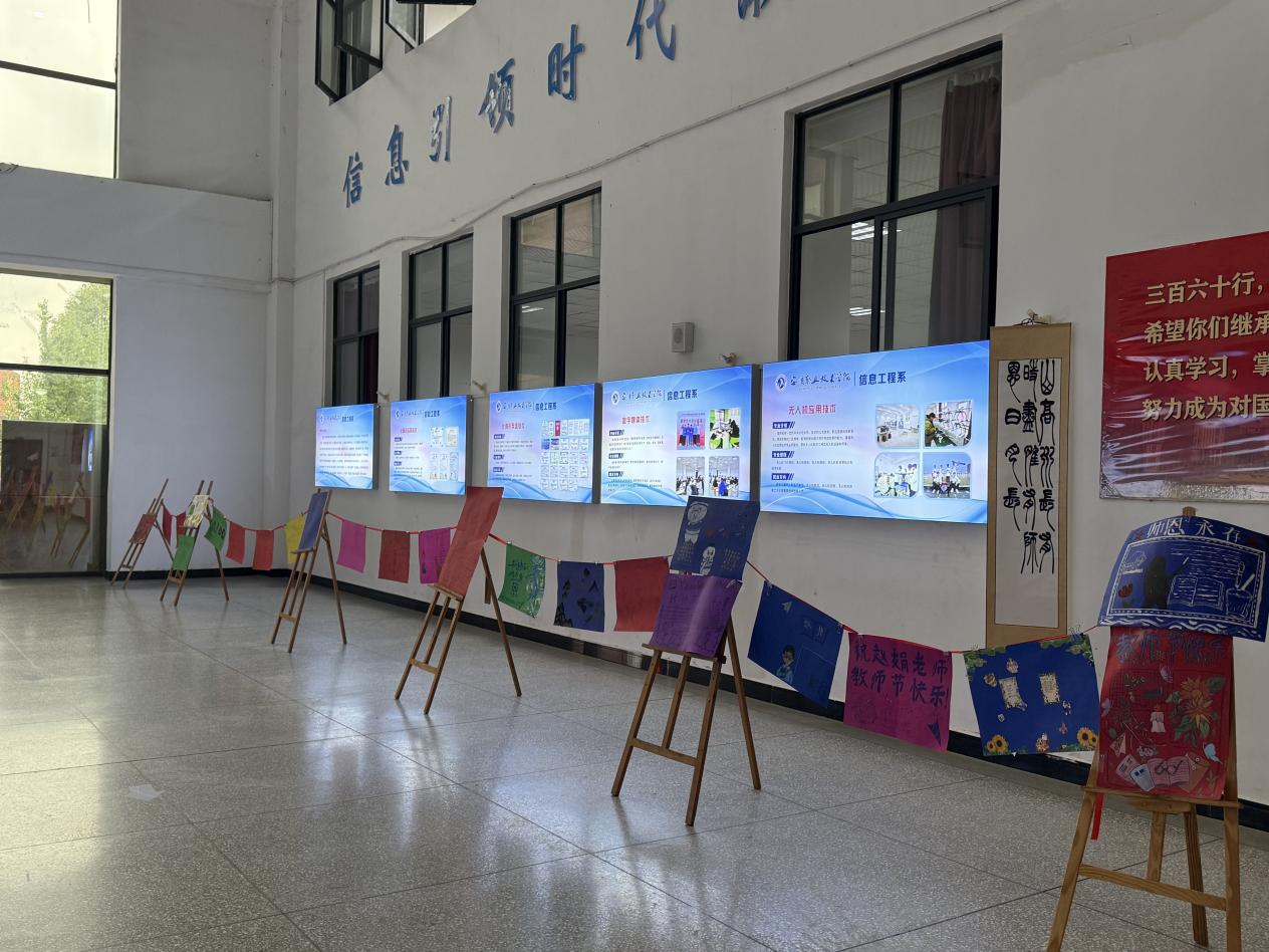 除了心型花墙,学生原创手抄报也是本次活动的一大亮点。信息工程系学子以纸为媒,通过绘画、书法、文字等多种形式,创作出一幅幅饱含真情的作品。手抄报内容涵盖教师日常点滴、学习感悟与节日祝福,既有“三尺讲台育英才”的赞美,也有“老师,您是我人生灯塔”的由衷感言。学生们巧妙运用色彩搭配与创意排版,将感恩之心融入一笔一划之中。这些作品陈列于大厅展板,形成一面独特的“感恩文化墙”。手抄报不仅展现了学生的艺术创造力,更让老师的辛勤付出被“看见”、被“铭记”,使感恩教育在潜移默化中深入人心。