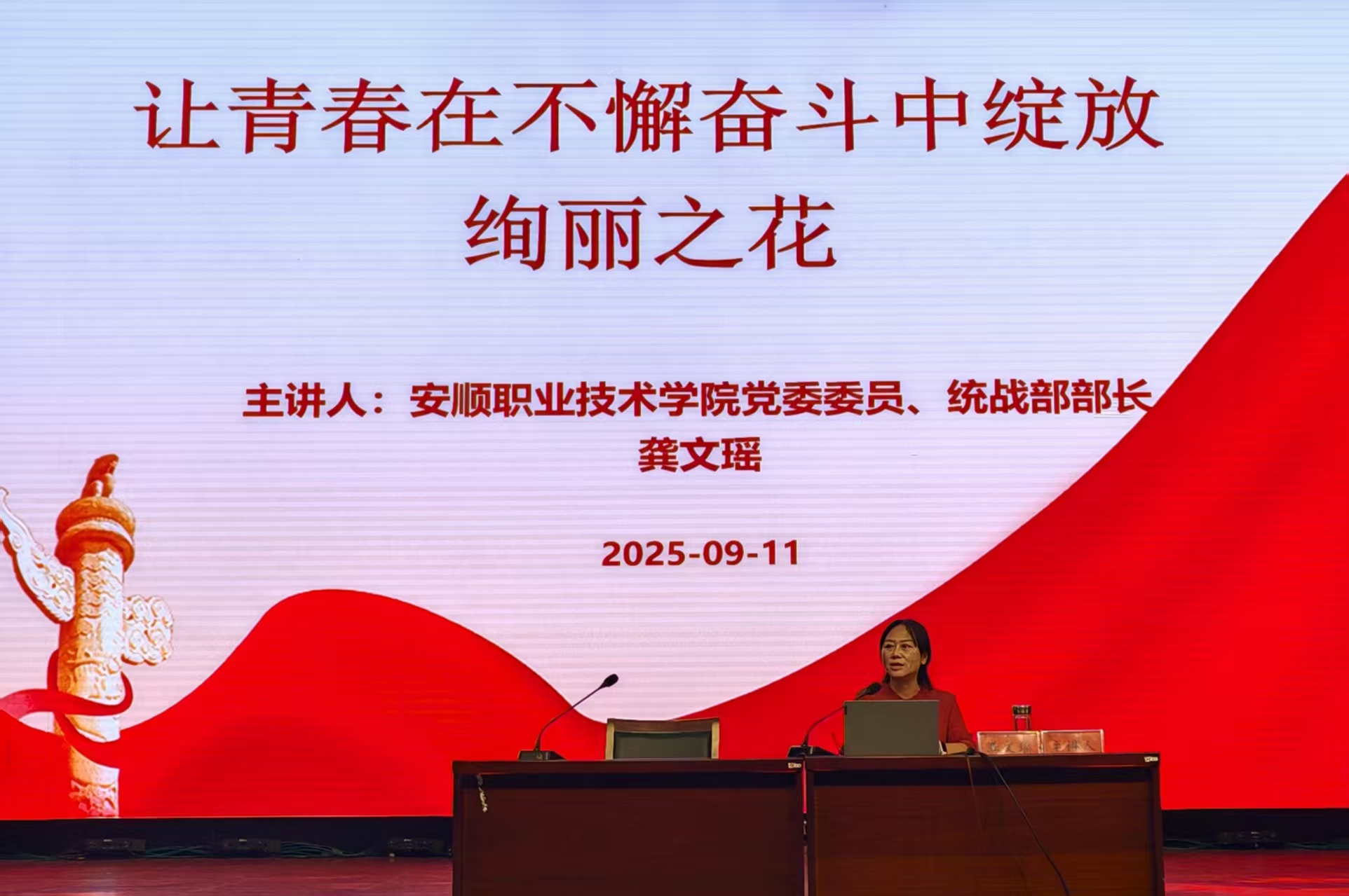 龚部长以“让青春在不懈奋斗中绽放绚丽之花”为题,围绕认识脚下的土地、心怀国之大者、勇担时代使命三个部分,向同学们介绍贵州省及安顺市丰富的自然资源、多元的民族文化和蓬勃发展的医药产业,为同学们勾勒职业发展蓝图和成长路径。龚部长强调,“国之大者”的根本是“人民幸福”,鼓励同学们将个人理想融入国家发展大局。