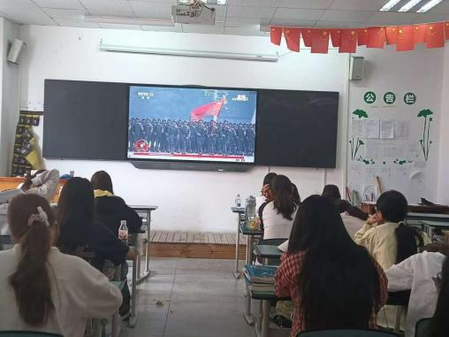 观看过程中,全体师生庄严肃穆,全神贯注,被军人坚毅的眼神、整齐的步伐和先进的装备深深震撼,深刻感受阅兵仪式所传递的强国强军信念与民族自豪感。通过阅兵,大家共同回首峥嵘岁月,缅怀英烈功勋,致敬伟大胜利,展望和平未来。