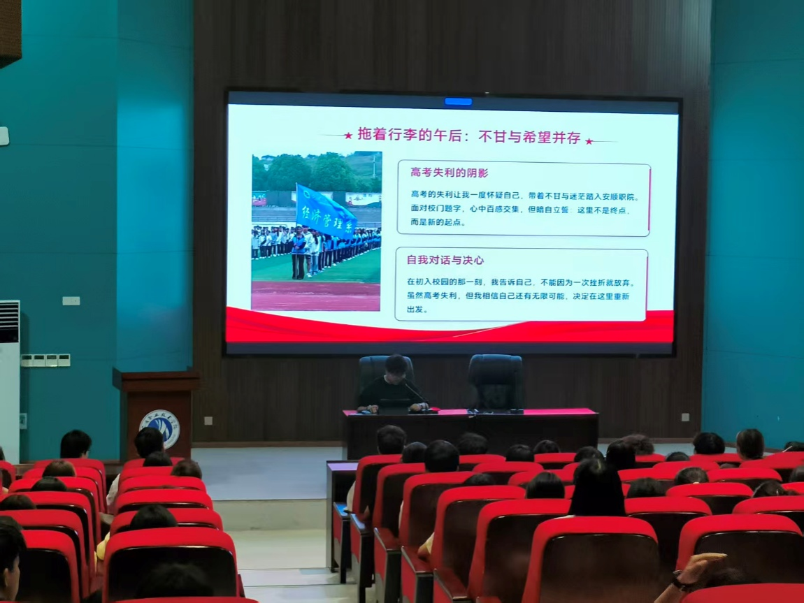 经济管理系团总支书记雷贵平老师首先为同学们阐述了大学生职业生涯规划的重要意义。他深情寄语新生:大学是人生旅程的新赛道,更是梦想启航的加油站,希望大家不仅要珍惜时光、勤学笃行,打下坚实的专业基础,更要勇于探索、认识自我,在丰富的实践中明确未来方向,将个人理想融入时代发展,书写无愧于青春的精彩篇章。随后,由2023级一名老生作为主讲人,他结合自身经历,以“从迷茫到闪耀——我的双轨进阶之路”为题,分享了他高考失利后的迷茫、在安顺职院重拾信心、确立新起点的一系列心路历程,鼓励新生不要因一次挫折否定自己,而应在大学这一全新舞台上整装再出发,勇敢追寻新的可能。