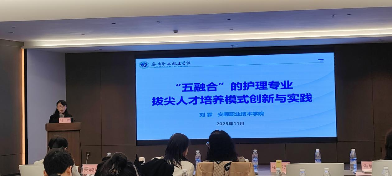 安顺职业技术学院护理系教师刘霖老师作为特邀嘉宾出席会议,并于11月7日上午在“护理专业拔尖人才培养”专题环节中,作了题为《“五融合”护理专业拔尖人才培养模式创新与实践》的学术报告。刘老师结合安顺职业技术学院在护理教育领域的实践探索,系统阐述了“五融合”育人模式的内涵构建、实施路径与阶段性成效,从建设背景、建设四路、建设举措、建设成效四个方面,全面展示了该模式在培养高技能护理人才方面的创新性与实效性,引起了与会代表的广泛关注与热烈讨论。