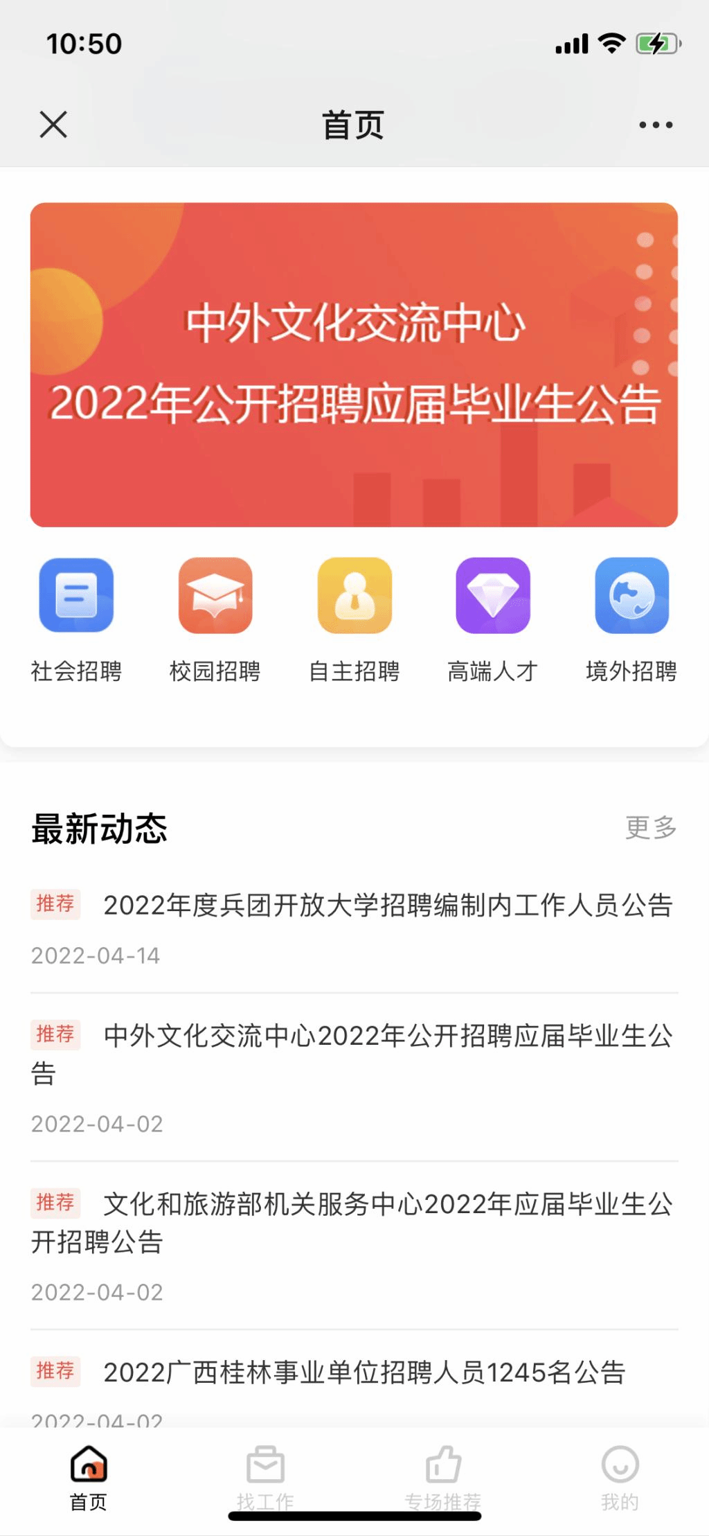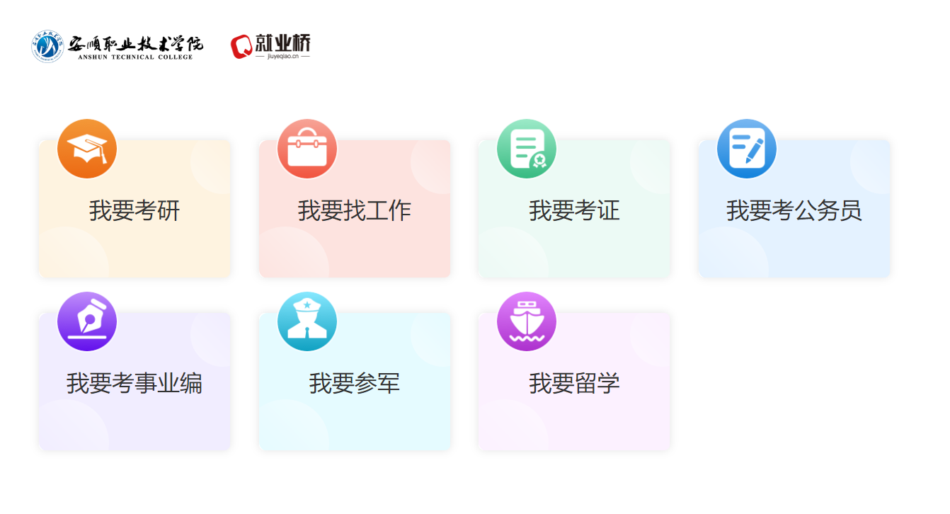 “就业桥”内容涵盖“我要考研”“我要考公务员”“我要考证”“我要考事业编”“我要参军”“我要留学”“我要定制服务”“我要找工作”八大内容模块。