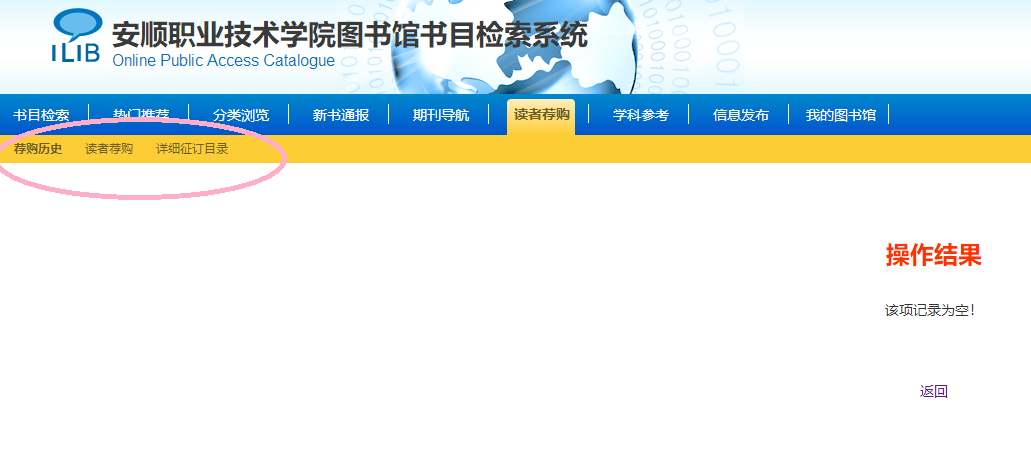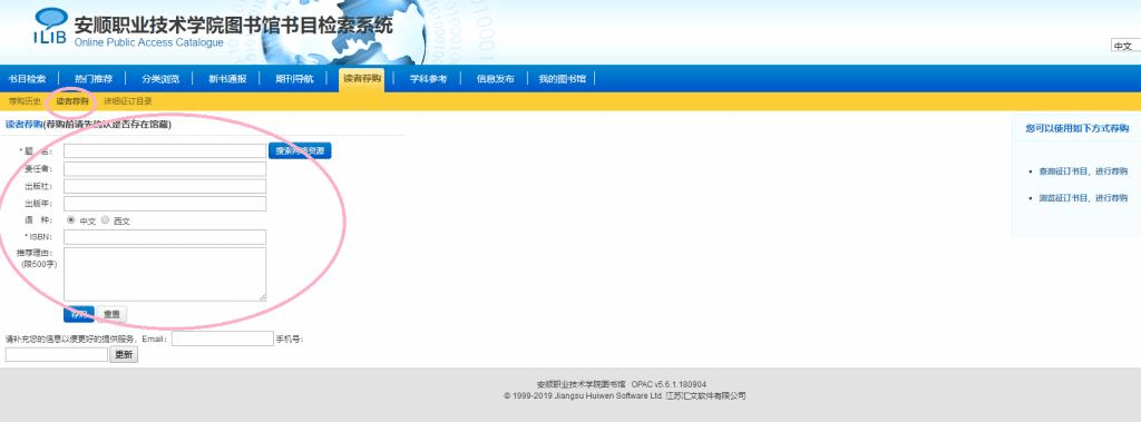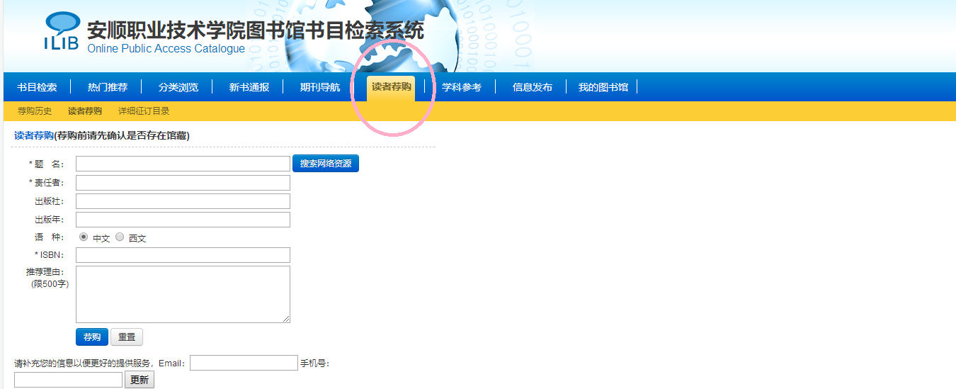 1.读者荐购之前,请先登录图书馆网页上的【馆藏查询】,进入【安顺职业技术学院图书馆书目检索系统】网页上“我的图书馆”,再点击“读者荐购”。